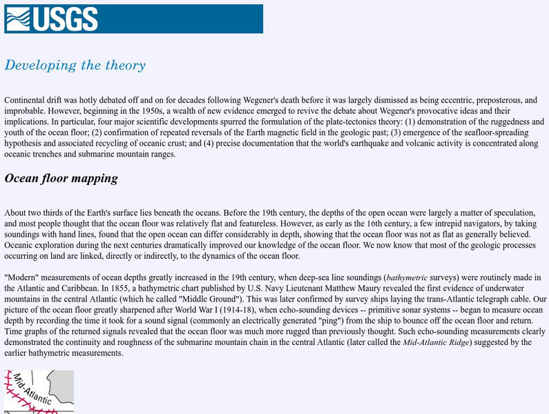 Instructional module focusing on the development of plate tectonic theory. Discussion includes the evidence of Pangaea, and the processes of seafloor topography and seafloor spreading. Site also includes an interactive practice quiz and...