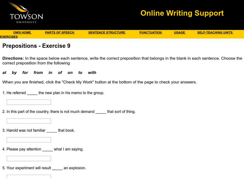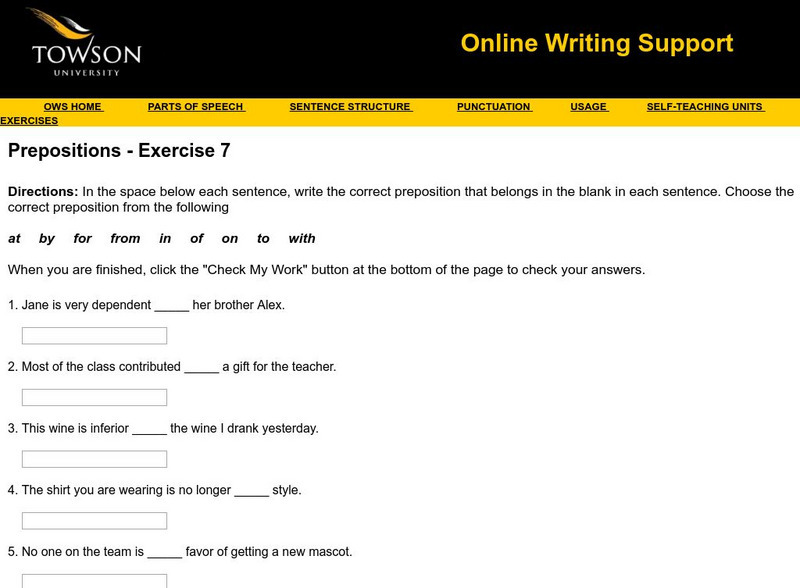 This page offers a list of links to exercises/quizzes on the following topics: Parts of Speech/Grammar; Prepositional and Verbal Phrases; Adjectival, Adverbial, Nominal Phrases, and Clauses; Punctuation, Sentence Structure, Usage,...