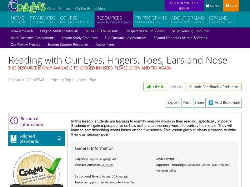 [Free Registration/Login Required] In this lesson, students are learning to identify sensory words in their reading, specifically in poetry. Students will gain a perspective on how authors use sensory words to portray their ideas. They...