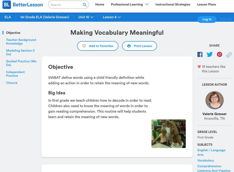 SWBAT define words using a child friendly definition while adding an action in order to retain the meaning of new words.
