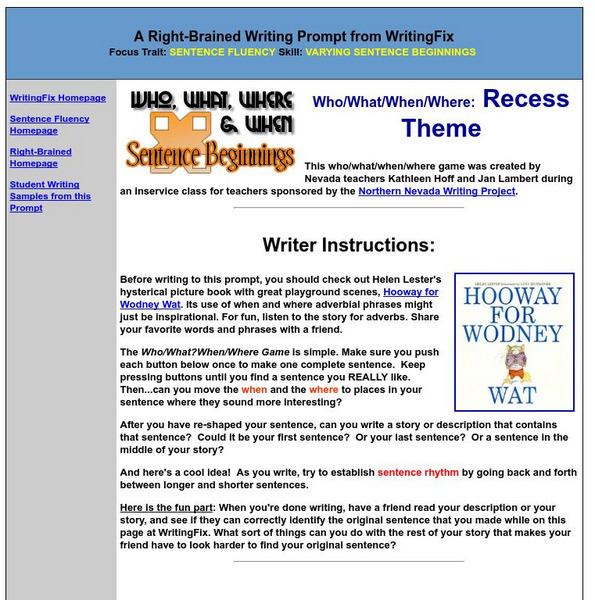 In this activity, Hooway for Wodney Watby, written by Helen Lester, is used as the mentor text for its use of adverbial phrases. After several exposures to the mentor text, students will use click the buttons with the words "Who",...