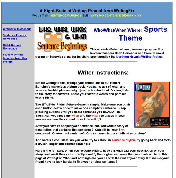 In this lesson, Hoops, written by Robert Burleigh, is used as the mentor text for its use of adverbial phrases. After several exposures to the mentor text, students will use click the buttons with the words "Who", "What", "When", and...