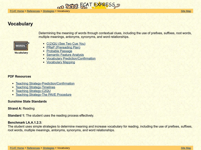 Strategies to help students recognize the meaning of words through contextual clues provided by a standardized test preparation site intended for fourth grade. Includes strategies such as C(2)QU (See Two Cue You), PReP (Prereading Plan),...