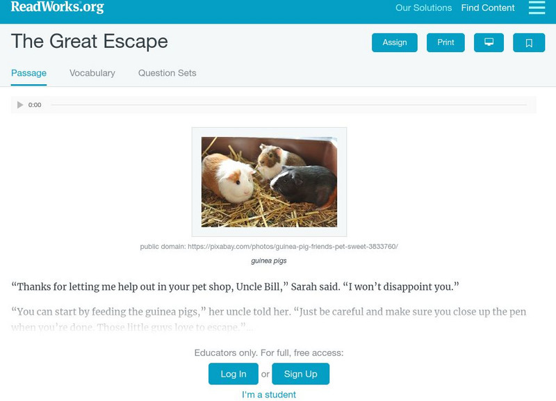 [Free Registration/Login Required] This fiction story shares the story of a girl who is taking care of animals and makes a mistake. This passage is a stand-alone curricular piece that reinforces essential reading skills and strategies...