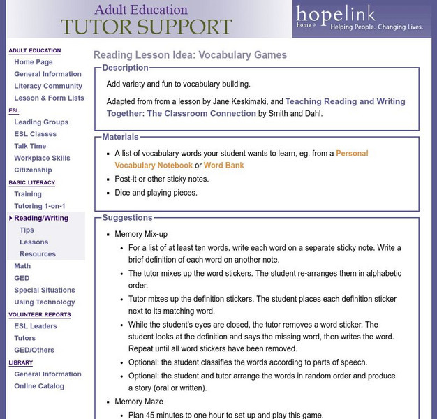 Hopelink: Reading Lesson Idea: Vocabulary Games