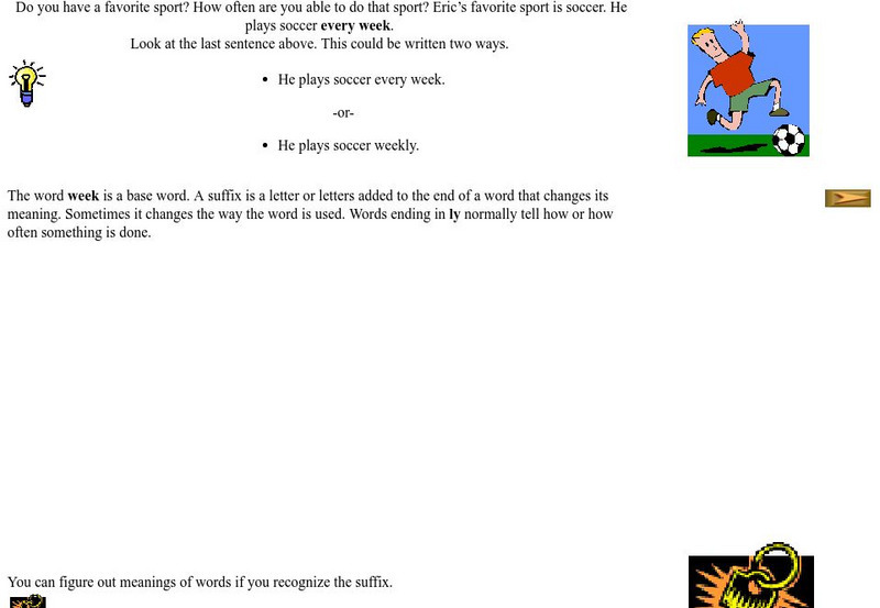 A brief tutorial about the use of the "ly" suffix and its effect on a word, followed by questions asking students to choose the appropriate "ly" word to complete sentences and to find the base word in four words with "ly" suffixes....