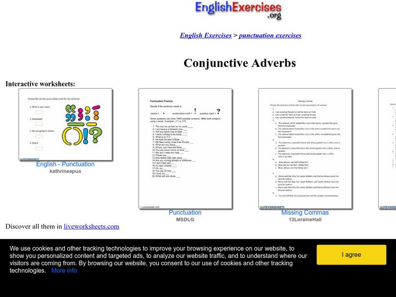 This learning module provides a partial list of common conjunctive adverbs, the sentence pattern with an example, and a five-question practice exercise.