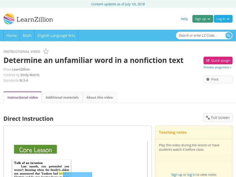 Learn Zillion: Determine an Unfamiliar Word in a Nonfiction Text