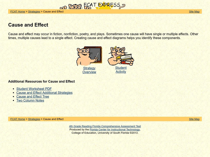 Site provides extensive assistance in preparing 4th grade students for Florida Comprehensive Assessment Test. This section helps students identify cause and effect in literature.