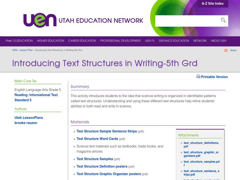 This lesson engages students in learning about text structures. Graphic organizers are provided to assist students in planning writings that have the following text structures: problem and solution; sequence; cause and effect; and...