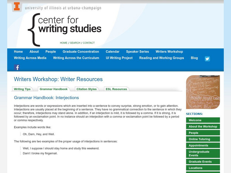 A resourceful and professional look at interjections. Provides definitions, examples, and additional information. A great site from the Writing Center at the University of Illinois.