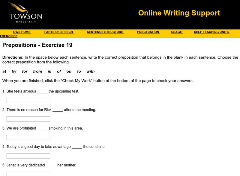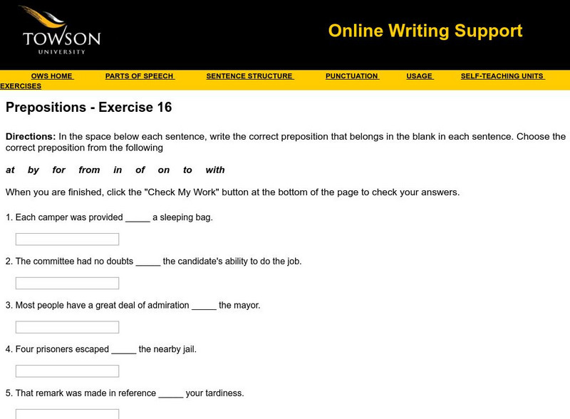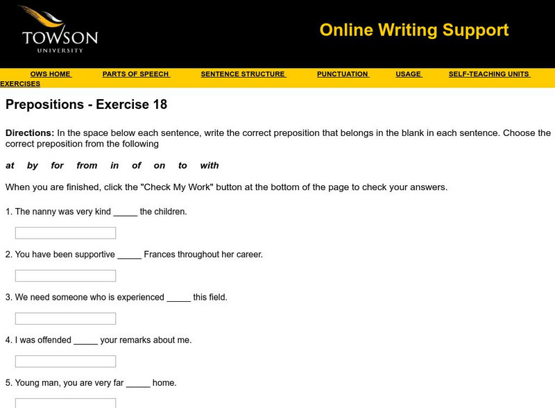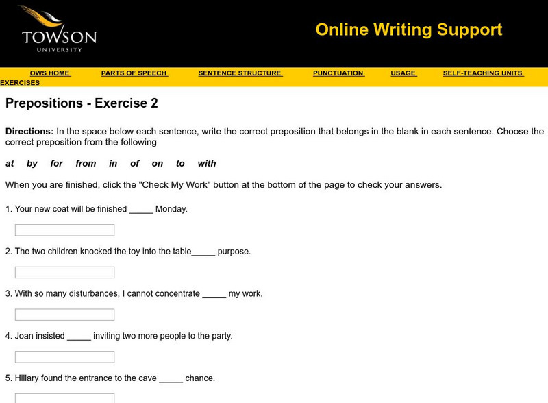 This site is prepared by Professor Charles Darling of Capital Community College and breaks down prepositions by time, place, and movement.