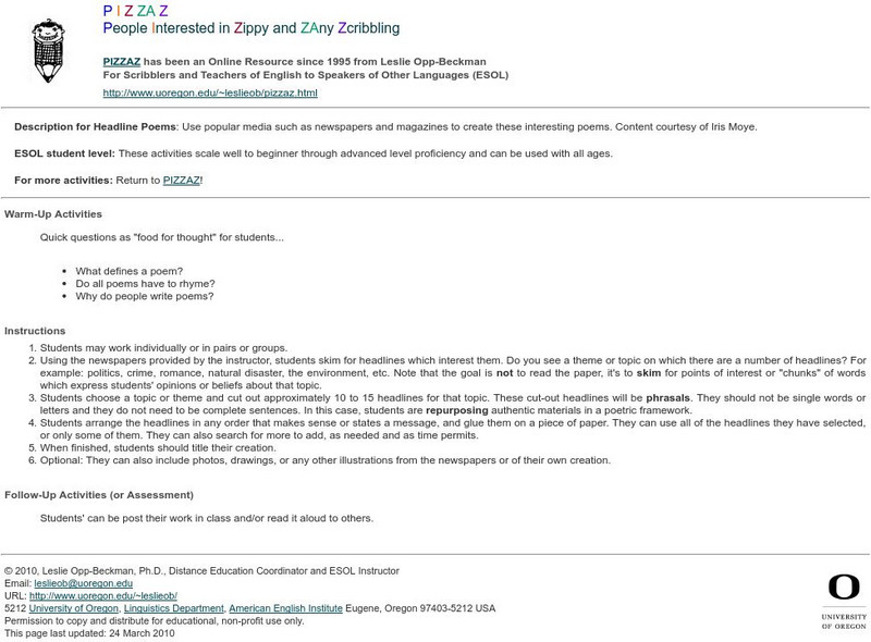 This PIZZAZ (People Interested in Zippy and ZAny Zcribbling) lesson plan will engage students in writing headline poems.