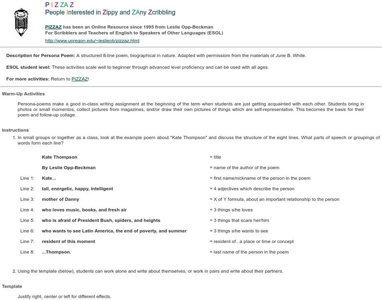 This PIZZAZ (People Interested in Zippy and ZAny Zcribbling) lesson plan will engage students in writing personal poems. Examples of personal poems are provided. A template is also included as a graphic organizing support for students.