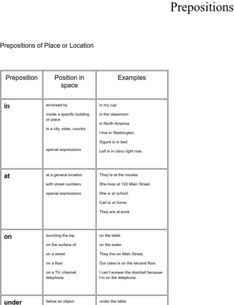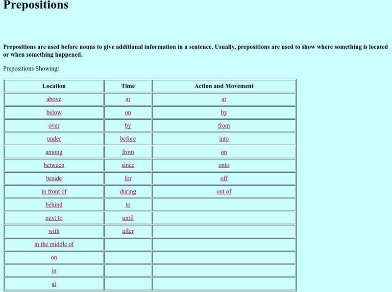 Mary Nell Sorensen teaches ESL at the University of Washington. Her page provides grammar tutorials for all the parts of speech. This specific pages covers prepositions