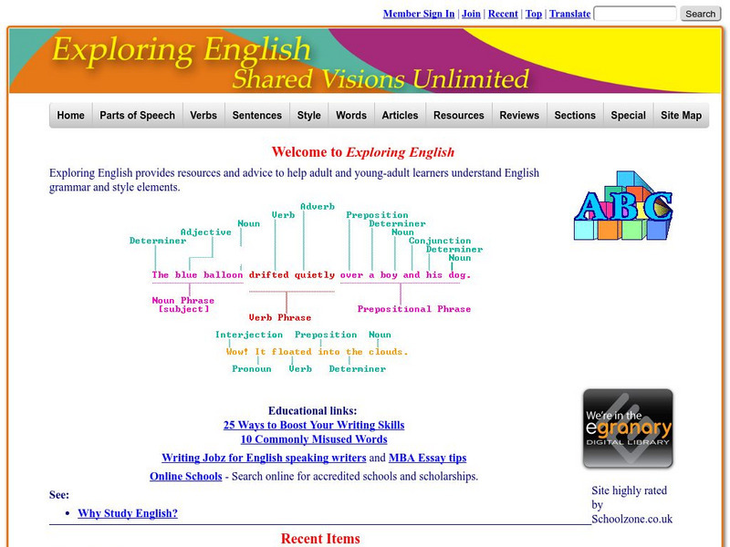 This is the portal to a website that provides a graphically colorful tutorial to the English language including the parts of speech, sentences, style guidelines, usage, punctuation, spelling, and so on.