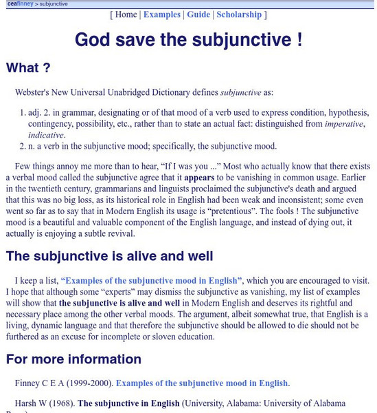Gives a brief, but good, introduction to the subjunctive mood. It also has links to other sites as well as other resources for information on the subjunctive mood.