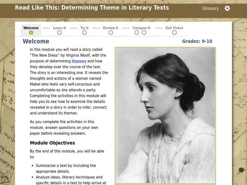 In this module you will read a story called "The New Dress" by Virginia Woolf, with the purpose of determining themes and how they develop over the course of the text.