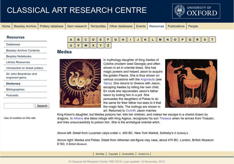 Illustrated dictionary entry for Medea, daughter to King Aeetes of Colchis. Illustrates her life, identifies her connection to the Argonauts and explores her magical witch-like powers.