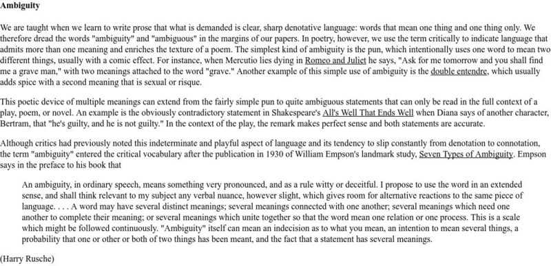 This site from The UVic Writer's Guide provides an excellent description of the term ambiguity. Site offers links to other literary terms and their meanings.