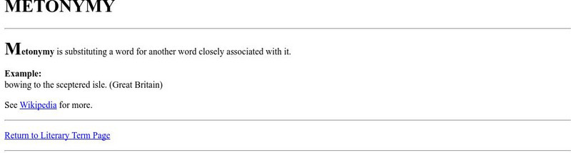 This is a glossary entry for the term "Metonymy" including a definition, an example, and a link to Wikipedia.