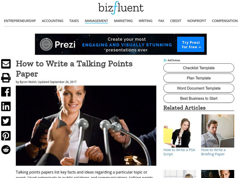 This article by Byron Walsh focuses on writing a talking points paper for a public speaker which consists of researched, accurate information provided in bulleted lists with follow up sentences on specific topics.