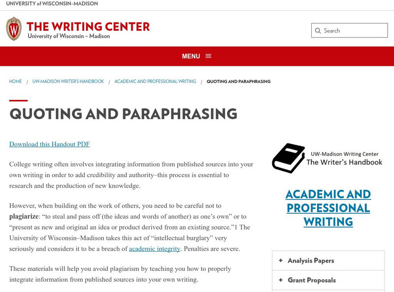 University of Wisconsin: Writing Center: Quoting and Paraphrasing