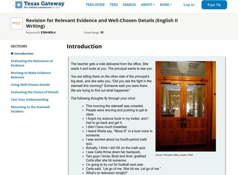 [Accessible by TX Educators. Free Registration/Login Required] You will learn strategies for evaluating and revising an essay so that it contains relevant evidence and well-chosen details.
