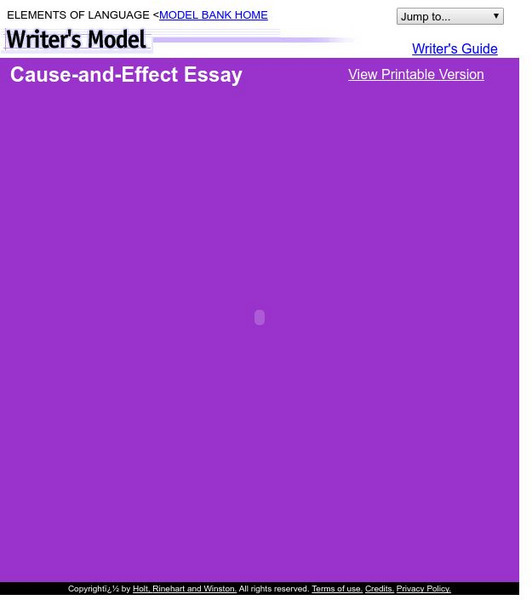 This five-page essay provides a written example of a cause and effect essay. Clicking on the "Writer's Guide" link in the upper right-hand corner of the page enables the user to get tips, directions, and explanations on the essay.