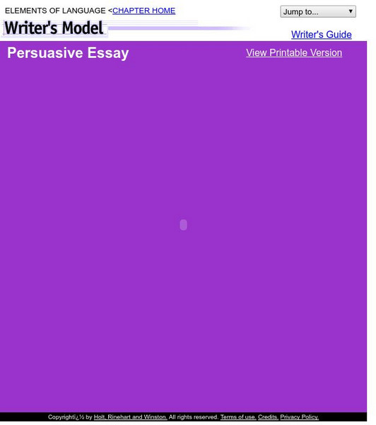 This five-page essay provides an example of a persuasive essay. Clicking on the "Writer's Guide" link in the upper right-hand corner of the page enables the user to get tips, directions, and explanations on the essay.