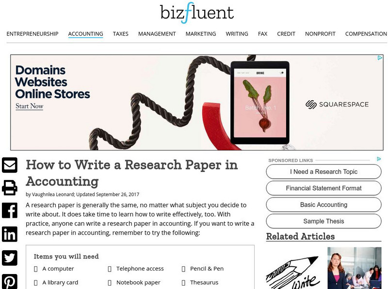 This article by Vaughnlea Leonard focuses on writing a research paper for an accounting class. The main differences from other research papers is choosing an appropriate topic and selecting sources written by accounting experts.
