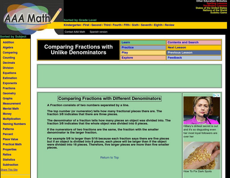 This site walks students through the process of comparing fractions with unlike denominators and allows them to practice the skill with self-checking exercises and games.