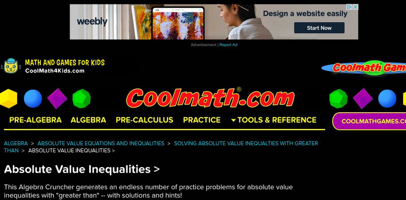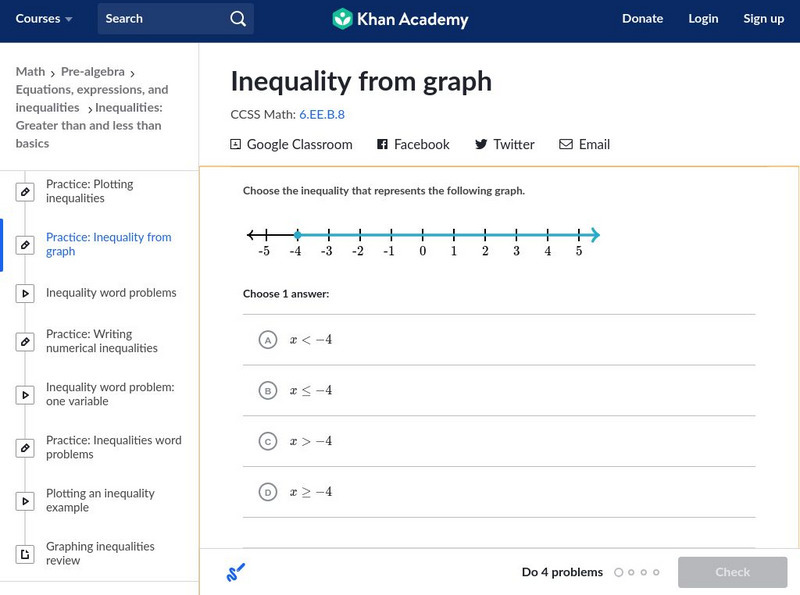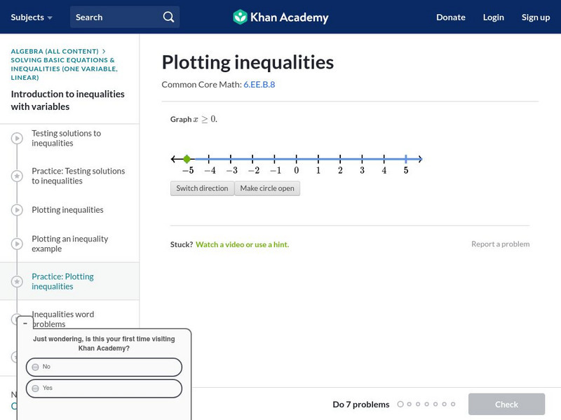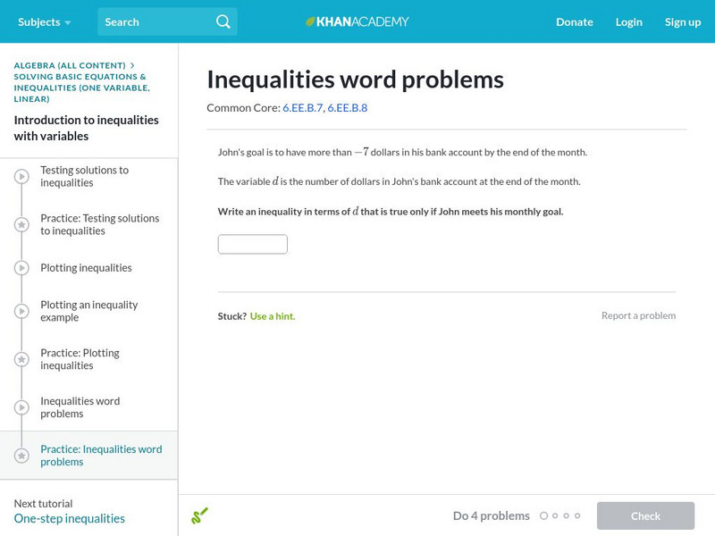 [Free Registration/Login may be required to access all resource tools.] On this site students learn to verify that solutions to inequalities are correct. Students can watch video tutorial, look at key vocabulary and attempt practice...