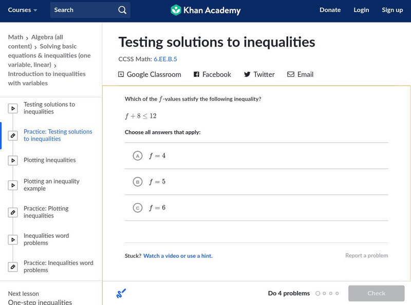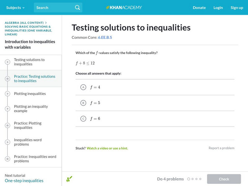 Practice plugging in values to inequalities and checking to see if the inequalities hold true. Students receive immediate feedback and have the opportunity to try questions repeatedly, watch a video or receive hints.