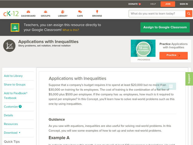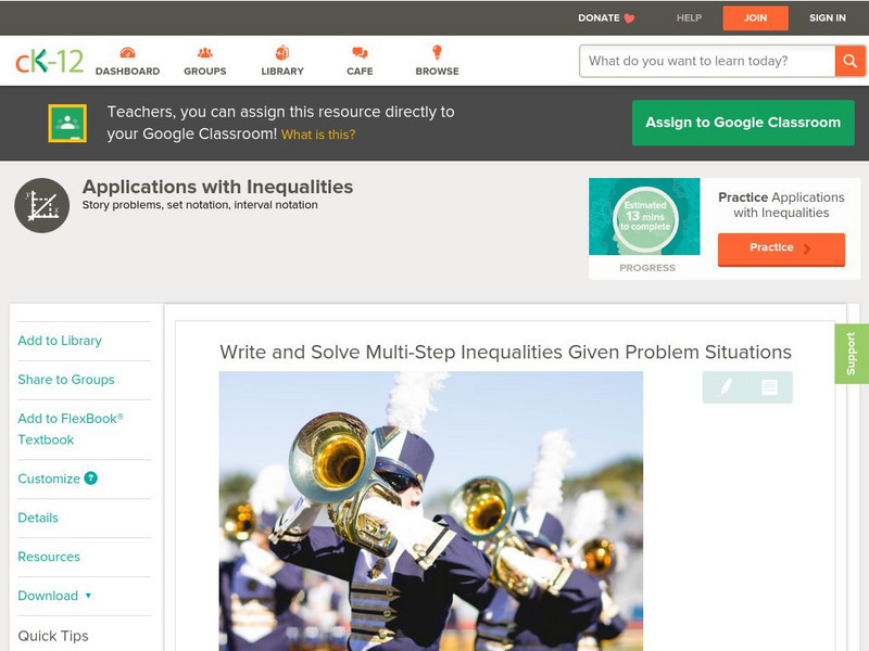 [Free Registration/Login may be required to access all resource tools.] In this lesson students learn how to solve real-world problems involving inequalities. Students watch a video tutorial, explore guided notes and attempt practice...