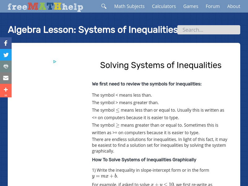 Beginning with understanding the less than and greater than symbols, this lesson will take you step by step through solving systems of inequalities. There are very good problems to use as examples.