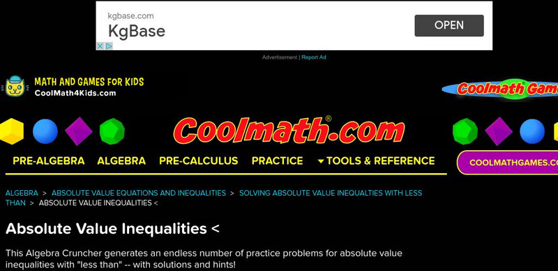 This Algebra Cruncher generates an endless number of practice problems for absolute value inequalities with "less than" with solutions and hints!