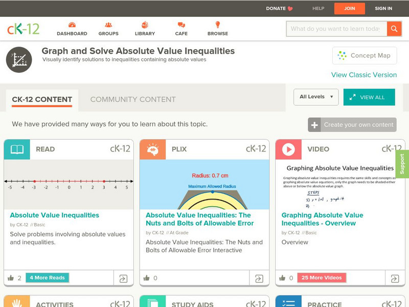 [Free Registration/Login may be required to access all resource tools.] In this lesson students solve problems involving absolute values and inequalities. Students can watch a video tutorial, explore guided notes and attempt practice...