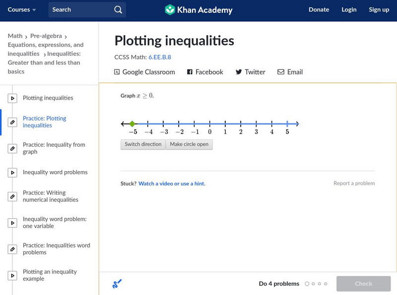 In this exercise, students practice plotting inequalities on a number line. Students receive immediate feedback and have the opportunity to get hints and try questions repeatedly.