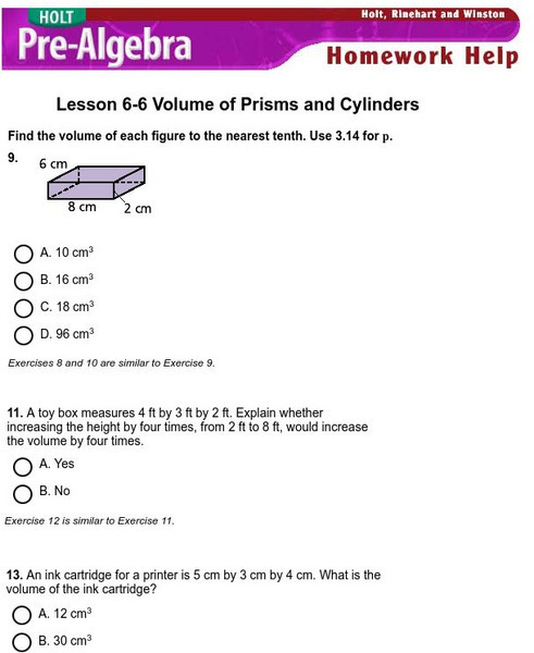 Holt, Rinehart and Winston: Homework Help Independent Practice: Volume of Prisms and Cylinders