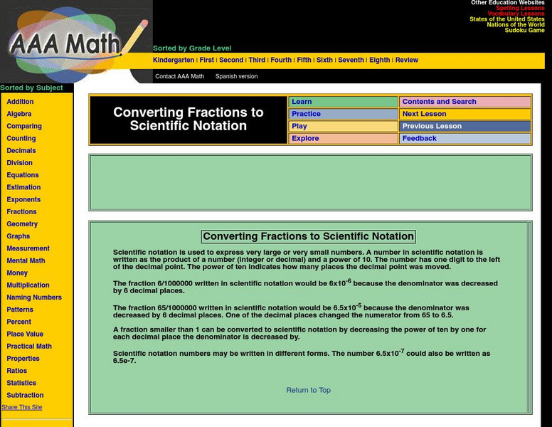 Students practice converting fractions to scientific notation in a series of self-check exercises and timed learning games.