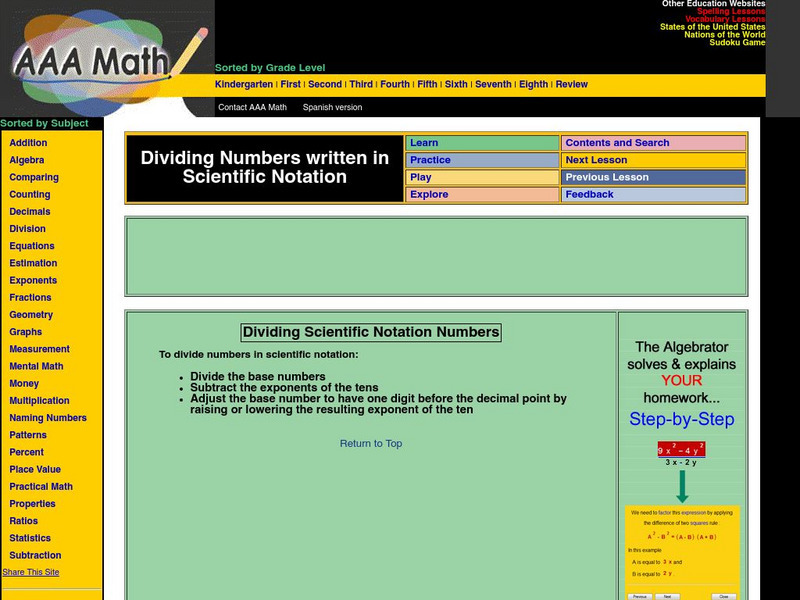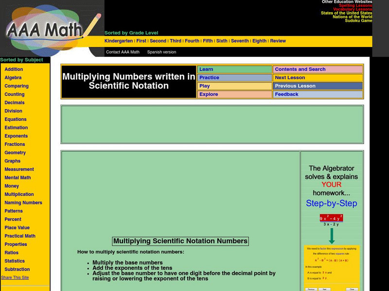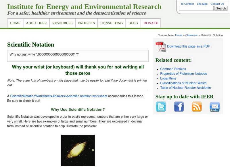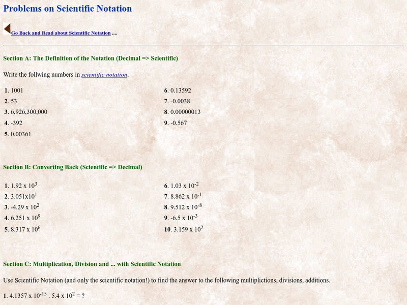 This is an excellent tutorial for scientific notation. The site covers the basics of what scientific notation is and how it is used. Rules for use in computations is also given. The site contains a link to a worksheet near the bottom of...