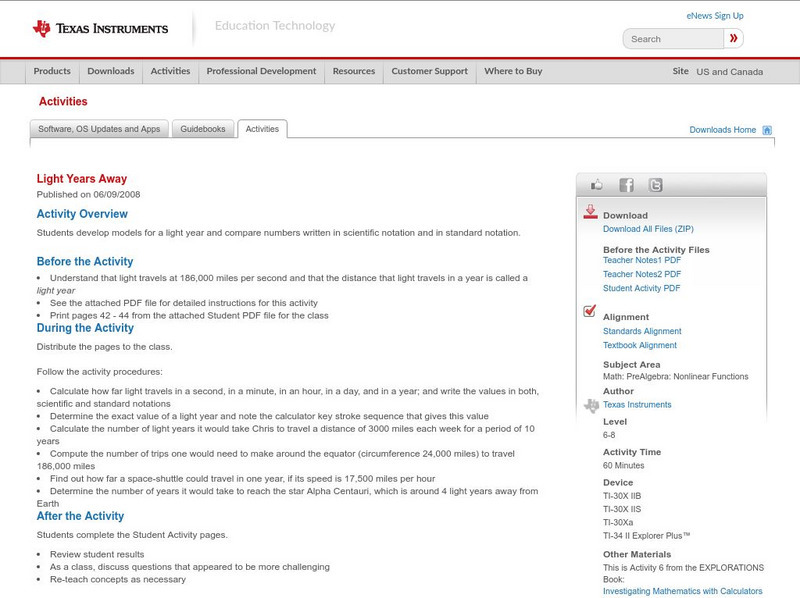 In this activity, students develop models for a light year and compare numbers written in scientific notation and in standard notation.