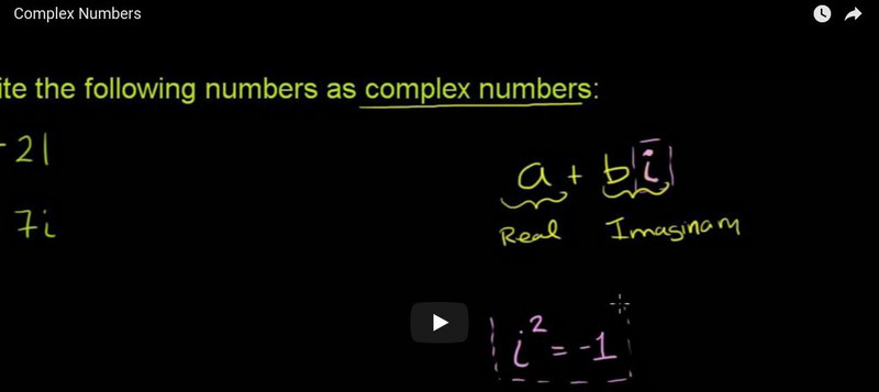 Video explains what complex numbers are and shows how to write them. Includes an example of writing a real number as a complex number. [2:21]