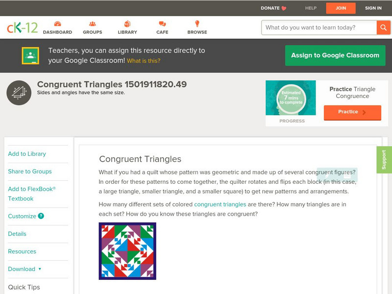 [Free Registration/Login may be required to access all resource tools.] This concept teaches students what it means for two triangles to be congruent and how to identify corresponding parts of congruent triangles. Students examine guided...