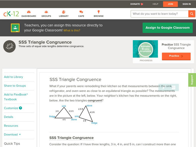 [Free Registration/Login may be required to access all resource tools.] This concept introduces students to the SSS Triangle Congruence Postulate and how to prove that two triangles are congruent given only information about their side...