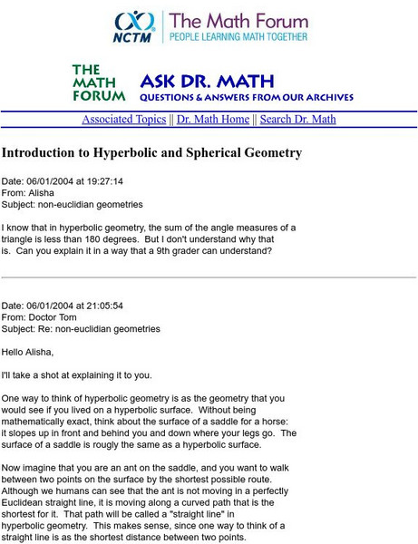The Math Forum: Ask Dr. Math: Hyperbolic Geometry