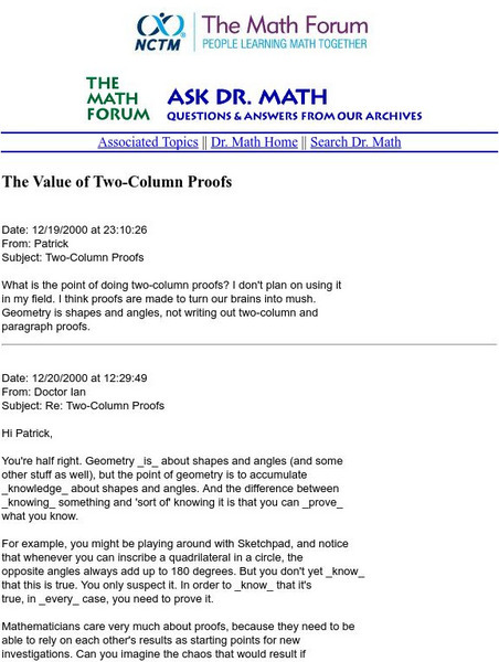 The Math Forum: Ask Dr. Math: The Value of Two Column Proofs