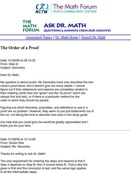 The Math Forum: Ask Dr. Math: Order of a Proof