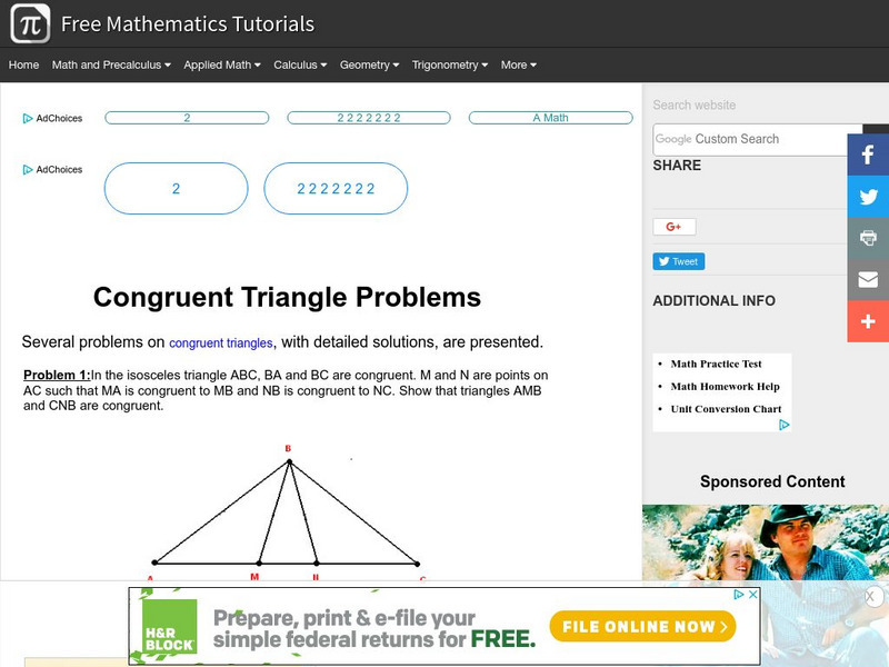 The geometry tutorial investigates congruent triangles. The activity has several examples with detailed solutions.